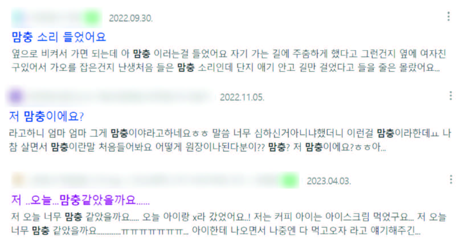 당장 포털사이트에 ‘맘충’을 검색하면 나오는 글이다. 오늘도 애엄마는 스스로에게 맘충적인 요소가 있었는지 되돌아본다. 가게를 잘못 골랐는지, 길가에서 애를 안고 있던 게 잘못이었는지. 무엇이 애엄마를 끊임없는 자기검열 속으로 빠뜨렸을까.