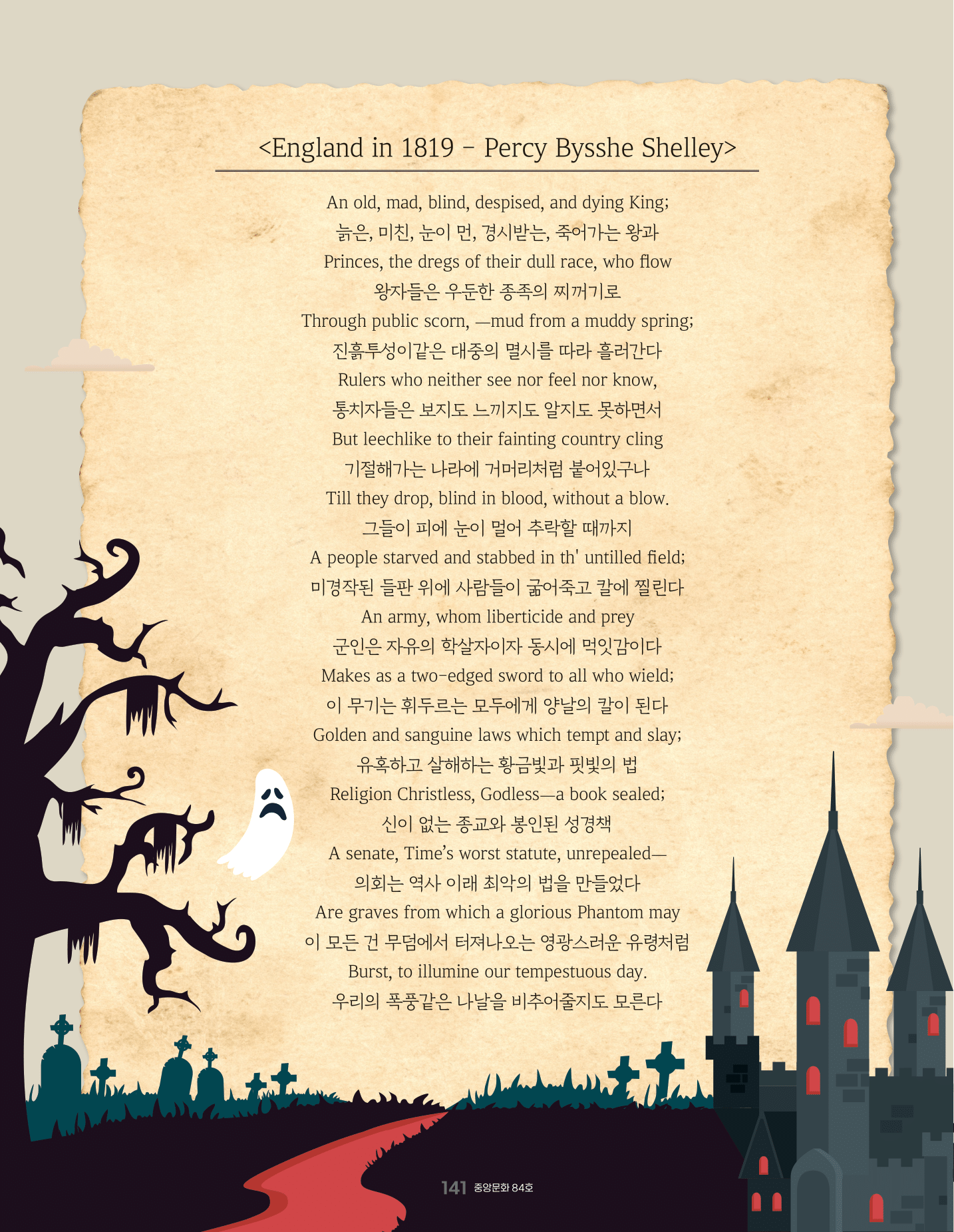 일례로 낭만주의 시인 퍼시 비시 셸리(Percy Bysshe Shelley)가 쓴 ‘1819년의 영국(England in 1819)’을 들 수 있다. 시는 1819년 영국 맨체스터 세인트 피터 광장에서 일어난 ‘피털루 대학살(Peterloo Massacre)’을 배경으로 한다. 국회법 개정을 요구하기 위해 모인 서민들이 군대에 의해 처참하게 학살당한 사건이다. 희생자들은 기계 파괴 행위 처벌법과 곡물 관세법을 비판했다. 당시 귀족 지주들은 수입 곡물에 관세를 부과해 배를 불렸다. 이로 인해 가난한 서민들은 수입된 쌀을 사 먹을 수 없었고 그 결과 수십만 명이 굶어 죽었다.