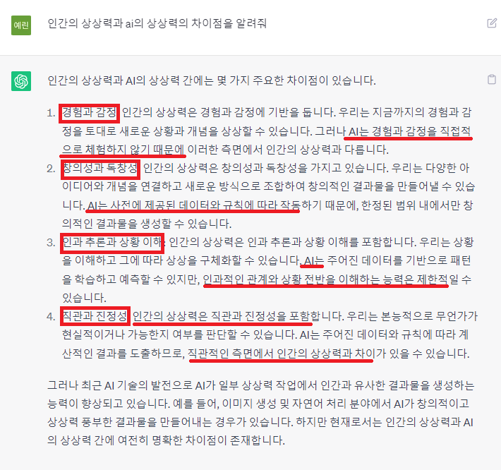 챗지피티에게 상상력의 유무와 인간의 상상력과 다른 점을 질문해 봤다. 그의 답변을 정리해 보자면 이러하다. 인공지능은 입력된 데이터 내에서만 새로운 것을 만들 수 있다. 반면 인간은 주관적 경험과 직관을 통해 개별적인 창의성을 지닌다. 이 점에서 인간의 상상력은 여타 동물이나 기계와 비교했을 때 독보적이다.
