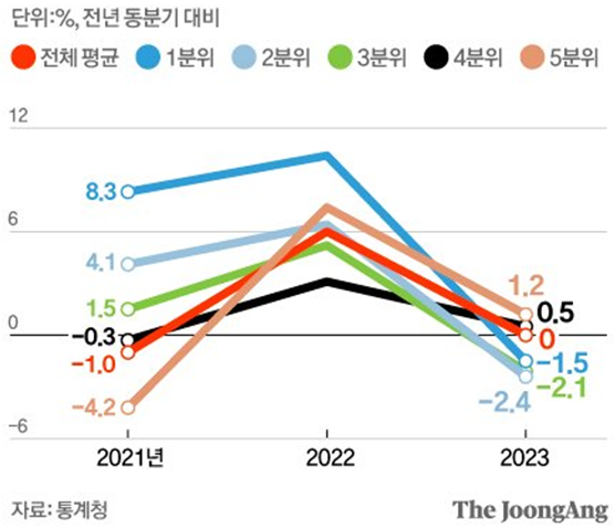 우리나라 경제의 허리인 중산층(소득 상위 40~60%)도 지속되는 고물가의 영향을 피할 수 없었다. 임금 인상률이 물가 인상률의 속도를 따라가지 못하면서 3분위의 실질소득은 2023년에 들어서 -2.1%로 감소했다. 중산층의 실질소득 감소는 단순히 국민 대다수의 생활이 어려워지는 것을 넘어 빈부격차의 악화를 알리는 신호탄이다. 또한 중산층은 공공요금 인상으로 지출이 증가했지만 어떠한 감면 혜택도 받지 못하고 있다. 정부는 공공요금 인상으로 인한 부담을 고려해 취약계층을 대상으로 감면 정책을 시행하고 있다. 하지만 소득 3분위, 즉 중산층에 해당하는 이들은 신청 자격조차 주어지지 않는다.