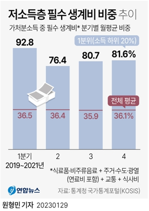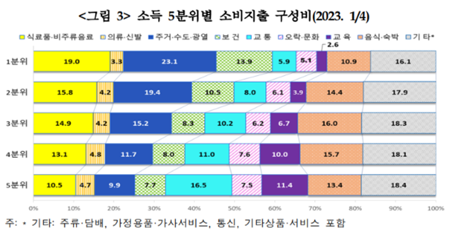물론 살아가는 데 있어 먹고 자는 것만 해결하면 되지 않냐고 생각할 수 있다. 하지만 이는 그저 생계를 간신히 유지할 뿐 인간다운 삶은 아니다. 2023년 1분기 1분위와 5분위의 소비지출은 나란히 증가했지만 그 돈의 사용처는 확연한 차이를 보였다. 1분위는 식료품과 공공요금에 지출하는 비율이 늘어났으나 5분위는 여가생활에 지출하는 비용이 많이 증가했다. 5분위의 교통비 지출 비율이 큰 이유도 지난 3년간의 거리두기가 끝나면서 여행과 문화생활이 증가했기 때문이다. 저소득층과 취약계층32이 추운 겨울 단칸방에서 난방비를 걱정할 때, 5분위 사람들은 추위를 피해 따뜻한 남쪽 나라로 떠나는 비행기에 몸을 싣는 형국이다.