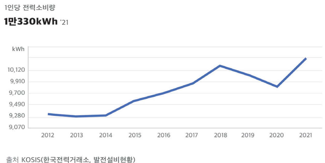 한전의 적자가 눈덩이처럼 불어나자 정부는 국민의 과도한 전력 사용을 지적했다. 2021년 1인당 전력 소비량은 1만 330kWh을 달성했다. 이는 역대 최고치로 1인당 전력 사용량이 세계 3위에 도달하는 수치다. 그러나 여기에는 큰 함정이 있다29. 1인당 전력 소비량은 전체 전력 소비량을 국민 수로 나눠 계산한다. 여기에는 가정용을 비롯한 모든 전력 분야가 포함되는데 그중 산업∙일반용 전력 사용률이 전체의 77%를 차지한다. 일반 가정이 아닌 기업의 사용량까지 포함한 지표를 가지고 1인당 전력 사용량이 세계 최고 수준이라 말하는 것은 지극히 모순적이다. 더구나 제조업 중심의 우리나라 경제 구조 특성상 상공업용 전력량을 더하면 전체 사용량이 기하급수적으로 늘어날 수밖에 없다. 전체의 8할을 차지하는 상공업용 전력을 배제하지 않은 채 국민의 전력 낭비를 비판하는 것은 과도한 책임 전가라 할 수 있다.