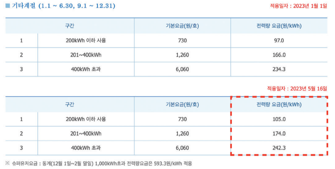 - 4인 가구 평균 전기 사용량 332kWh, 가스 사용량 3,861MJ을 기준으로 한다. 결과적으로 2023년 1분기 대비 평균 3,020원과 4,431원을 더 부담해야 하는 셈이다. [본문으로]
