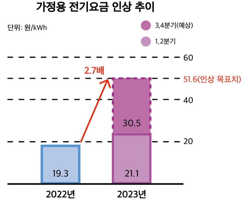 감당하기 힘들 정도로 빠르게 늘어난 영업손실과 부채 더미는 한전의 운영을 위협했다. 이에 산업통상자원부(이하 산업부)는 전기요금 인상을 통해 누적적자를 해결하겠다고 선언했다. 2023년 동안 kWh당 최소 51.6원에 도달하는 것을 목표로 삼았지만 올해의 절반 지난 현재로서는 절반도 도달하지 못한 상태다. 물론 지금까지의 인상분만 해도 이미 2022년의 인상분을 넘어선 상태다. 만약 3·4분기 동안 남은 목표치를 집행한다면 작년의 2.7배에 해당하는 전기요금을 부담하게 된다.