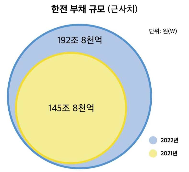 재정난에 시달리는 건 한전도 마찬가지다. 아니 현재 한전의 재정 상황은 어떤 공공기관보다도 심각하다. 2022년 한전 부채 규모는 전체 공공기관 중 사실상 최대치를 기록했다18. 적자 역시 막대하다. 전년 대비 약 47조원이 증가해 총 192조 8,000억 원이라는 부채가 발생했다. 올해 1분기, 3개월간 한전과 자회사19가 지불한 부채이자비용은 1조 480억원에 달했다. 이를 계산해보면 하루에만 이자가 116억원씩 생겨나는 꼴이다20. 한 달이 아니라 무려 하루에 116억! 자회사를 제외하고도 71억원을 기록했다. 지난해의 3배에 달하는 비용이다. 덧붙여 매년 착실히 몸집을 불려 온 누적적자는 44조 원을 달성했다.