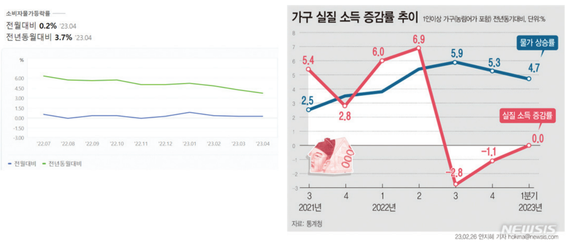 소비자 물가 등락률(왼쪽)과 실질소득 증감률 추이(오른쪽). 국가통계포털(왼쪽)과 뉴시스(오른쪽)11.