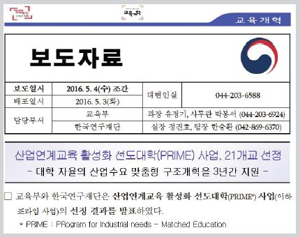 - 동아일보, “3년간 6000억 지원 ‘프라임 사업’ 21개 대학 선정”, 2016.05.04., 유덕영·이은택 기자 [본문으로]