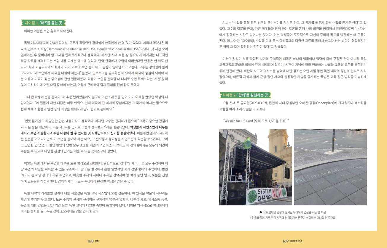 한 번은 독일 친구에게 물어봤다. 학생들이 정치적, 사회적으로 자기의 목소리를 내는 데 주저하는 사람이 없느냐고. 그리고 반대하는 사람이 없느냐고 말이다. 그러자 그 친구가 “오히려 반대로 물을게. 학생들이 대학교에서 자기 의견을 내세우고 함께 토론하는 게 왜 문제이고 의문을 가져야 해?”라고 되물었다. 부끄럽게도 아무런 말을 하지 못했다. 그리고 이 질문을 처음 생각해 봤다. 정말 왜 그럴까?