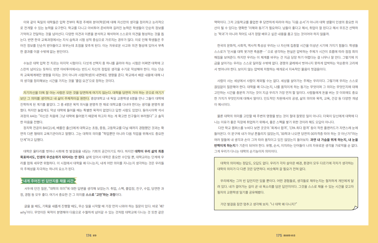 대학의 의미에는 정답도, 오답도 없다. 우리가 각자 살아온 배경, 환경이 모두 다르기에 각자가 생각하는 대학의 의미가 다 다른 것은 당연하다. 비슷해져 갈 필요가 전혀 없다.