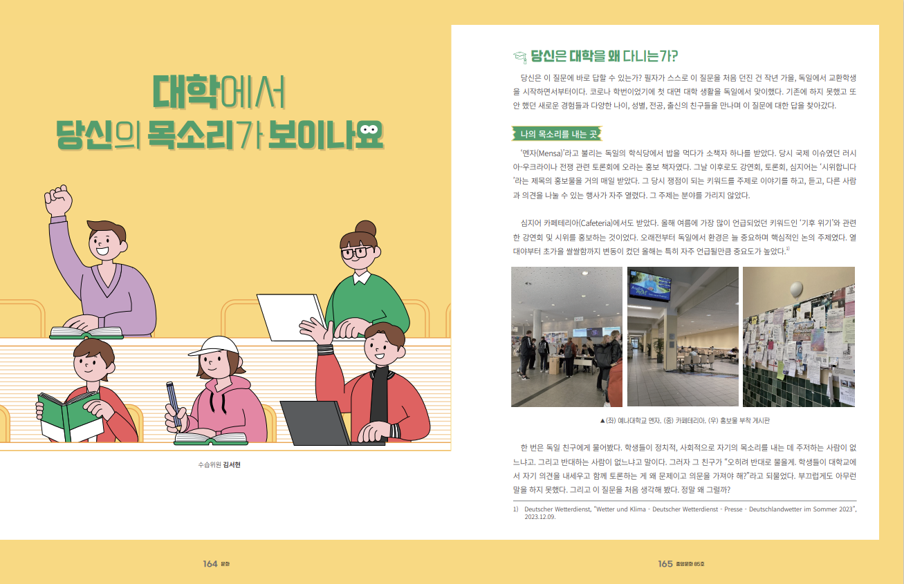 ‘멘자(Mensa)’라고 불리는 독일의 학식당에서 밥을 먹다가 소책자 하나를 받았다. 당시 국제 이슈였던 러시아-우크라이나 전쟁 관련 토론회에 오라는 홍보 책자였다. 그날 이후로도 강연회, 토론회, 심지어는 ‘시위합니다’라는 제목의 홍보물을 거의 매일 받았다. 그 당시 쟁점이 되는 키워드를 주제로 이야기를 하고, 듣고, 다른 사람과 의견을 나눌 수 있는 행사가 자주 열렸다. 그 주제는 분야를 가리지 않았다.