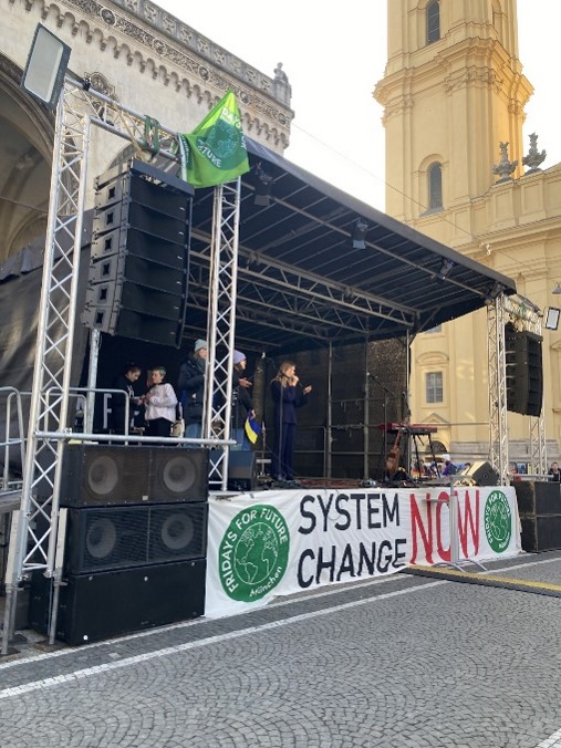 ▲ (좌) 오데온 광장에 설치된 무대에서 연설을 하는 한 학생, (우)길바닥에 기후 위기 시위에 함께하자는 문구가 쓰여있는 예나의 한 길거리