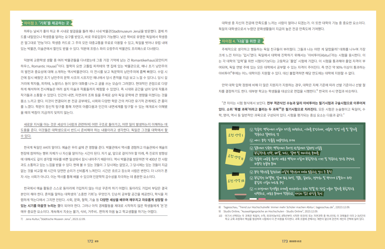 주체적으로 생각하고 행동하는 독일 친구들이 부러웠다. 그들과 나는 어떤 게 달랐을까? 대화를 나누며 가장 크게 느낀 차이는 ‘입시’였다. 독일에서 대학에 진학하기 위해서는 ‘아비투어(Abitur)’라는 시험을 응시한다. 이는 각 대학의 ‘입학’을 위한 시험이기보다는 고등학교 ‘졸업’ 시험에 가깝다. 이 시험을 통과해야 졸업 자격이 부여되며, 독일 연방 주에 있는 모든 대학에서 공부할 수 있는 자격이 주어진다. 즉 연간 약 90% 이상이 통과하는 아비투어 8후에는 어느 대학이든 지원할 수 있다. 대신 불합격하면 해당 연도에는 대학에 지원할 수 없다.