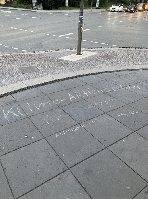 ▲ (좌) 오데온 광장에 설치된 무대에서 연설을 하는 한 학생, (우)길바닥에 기후 위기 시위에 함께하자는 문구가 쓰여있는 예나의 한 길거리