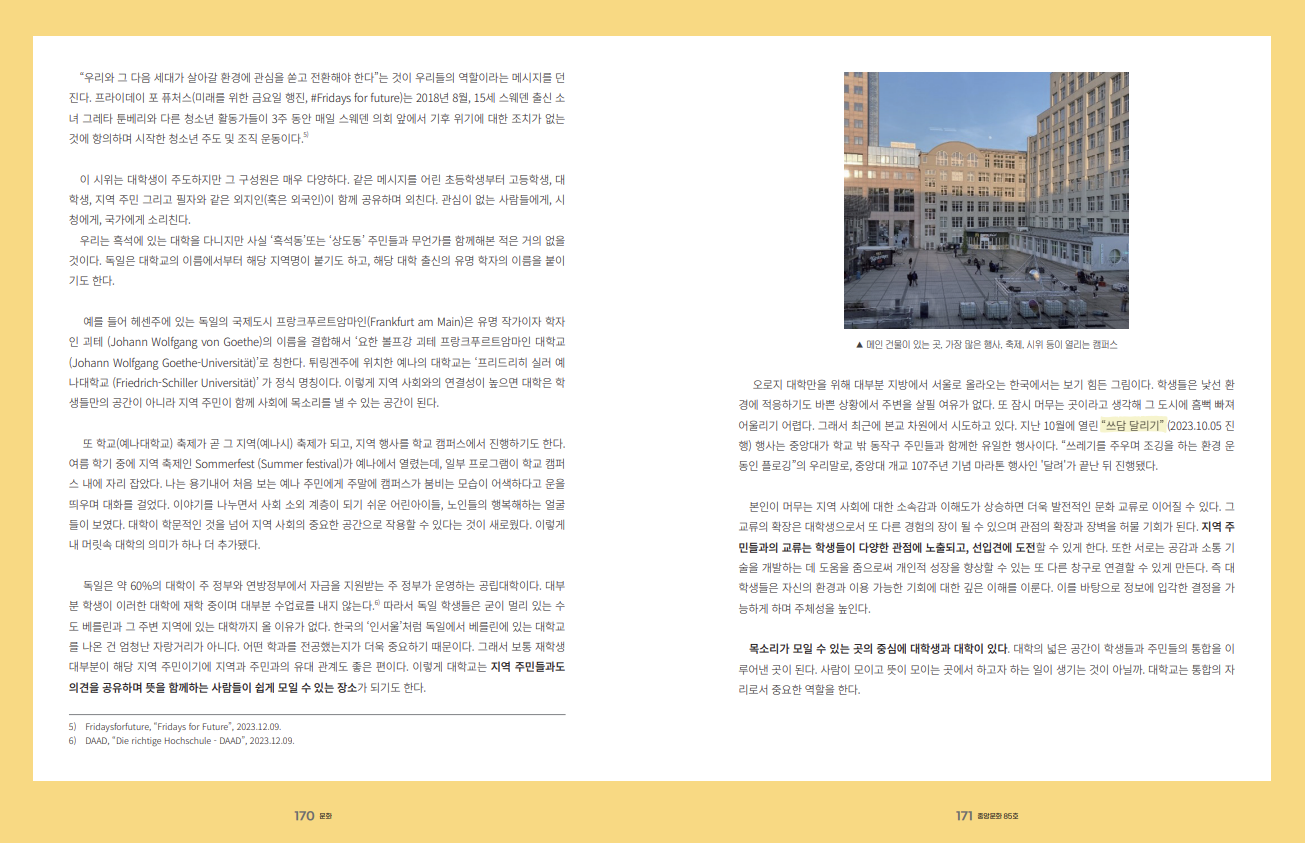 ‘멘자(Mensa)’라고 불리는 독일의 학식당에서 밥을 먹다가 소책자 하나를 받았다. 당시 국제 이슈였던 러시아-우크라이나 전쟁 관련 토론회에 오라는 홍보 책자였다. 그날 이후로도 강연회, 토론회, 심지어는 ‘시위합니다’라는 제목의 홍보물을 거의 매일 받았다. 그 당시 쟁점이 되는 키워드를 주제로 이야기를 하고, 듣고, 다른 사람과 의견을 나눌 수 있는 행사가 자주 열렸다. 그 주제는 분야를 가리지 않았다.