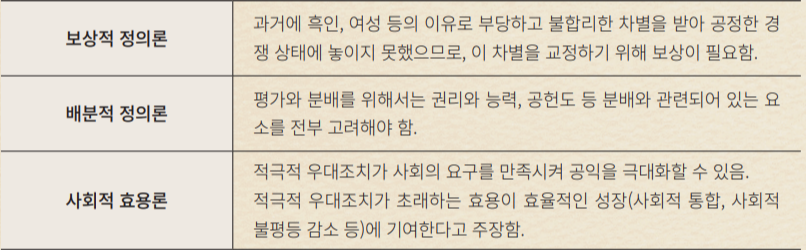 대한민국은 어떠한가. 물론 한국이 미국만큼 다인종 사회는 아니다. 국내에서도 우대정책들이 다양하게 적용되고 있지만, 양극화의 위기는 아직 끝나지 않았다. 2022년 “공공기관 및 500인 이상 기업”의 여성 고용 비율은 38.1%, 여성관리자 비율은 21.8%밖에 되지 않는다.51 이 명예교수는 노동시장에서 남녀의 비율이 균형을 이룬다면 더 이상 할당제를 유지할 필요가 없지만, 여전히 큰 폭으로 차이가 나타나는 현 상황에서는 차별 시정의 조치가 불가피함을 주장했다.