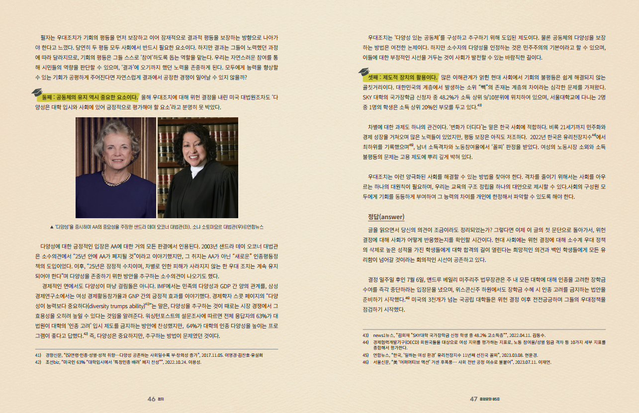둘째 : 공동체의 유지 역시 중요한 요소이다. 올해 우대조치에 대해 위헌 결정을 내린 미국 대법원조차도 ‘다양성은 대학 입시와 사회에 있어 긍정적으 로 평가해야 할 요소’라고 분명히 못 박았다.