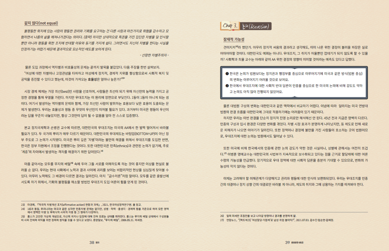 대한민국은 어떠한가. 물론 한국이 미국만큼 다인종 사회는 아니다. 국내에서도 우대정책들이 다양하게 적용되고 있지만, 양극화의 위기는 아직 끝나지 않았다. 2022년 “공공기관 및 500인 이상 기업”의 여성 고용 비율은 38.1%, 여성관리자 비율은 21.8%밖에 되지 않는다.51 이 명예교수는 노동시장에서 남녀의 비율이 균형을 이룬다면 더 이상 할당제를 유지할 필요가 없지만, 여전히 큰 폭으로 차이가 나타나는 현 상황에서는 차별 시정의 조치가 불가피함을 주장했다.