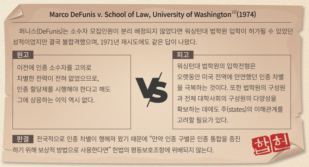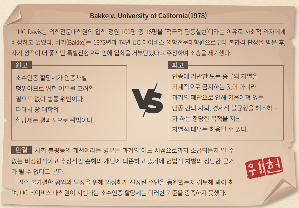 - 소수인종이라는 이유로 특정 가산점을 부여하는 것은 할당제에 해당해 위법이나, 소수인종을 하나의 요소로 고려하는 것은 정당하다는 해석이다. [본문으로]