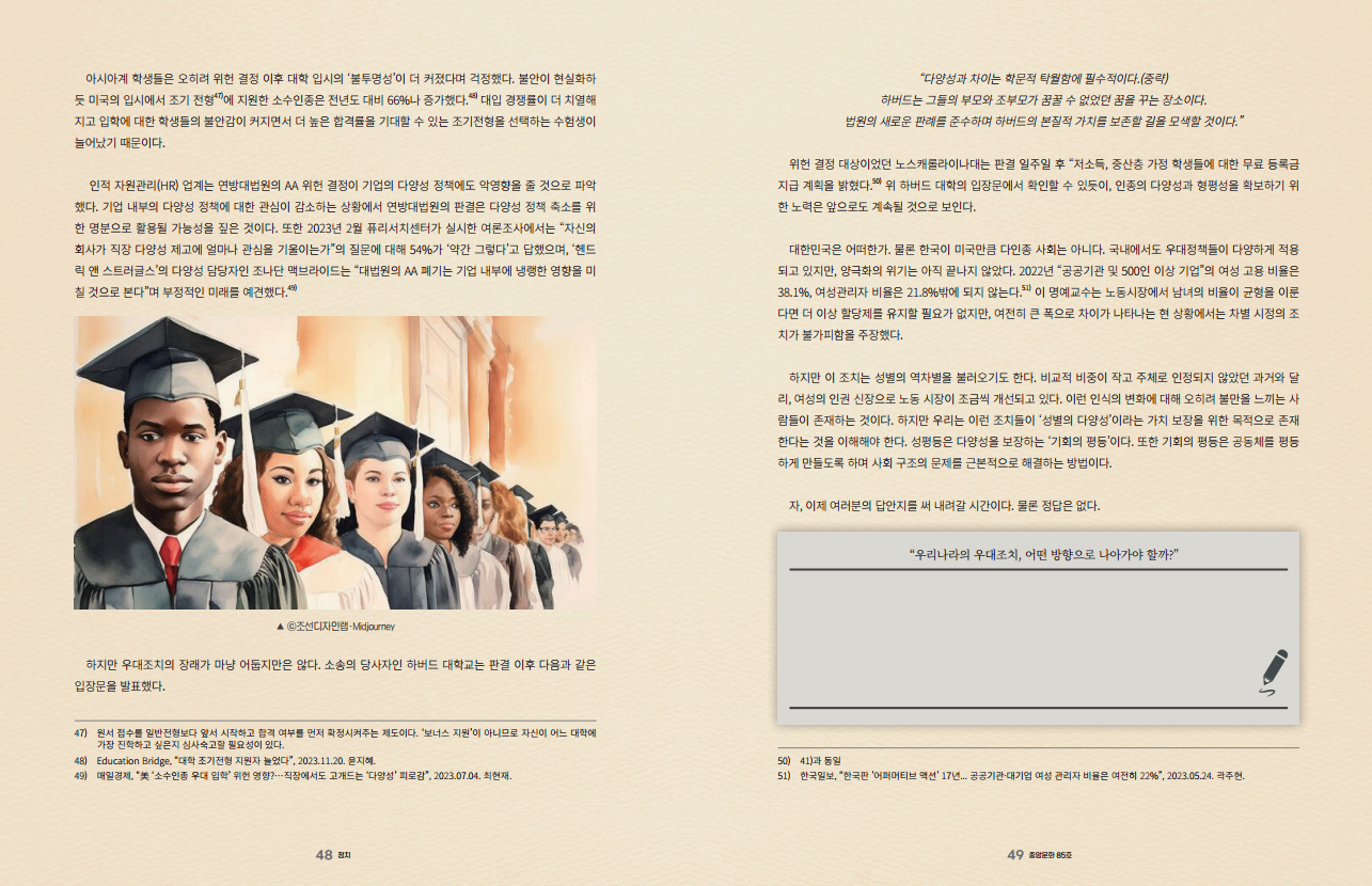 글을 시작하기 전, 질문을 던지려 한다. 우대조치가 필요하다고 생각하는가? 그리고, 만약 필요하다면 어떤 방향으로 나아가야 하는가? 해답은 저 끝에 있으니, 천천히 읽어가며 각자의 답을 찾아가 보자.