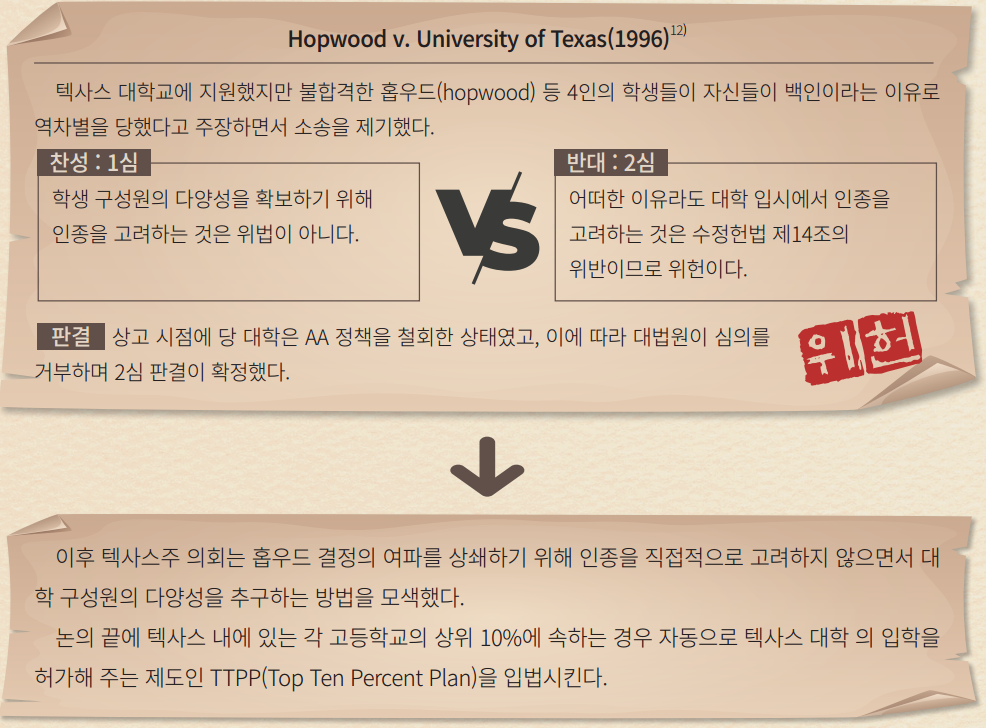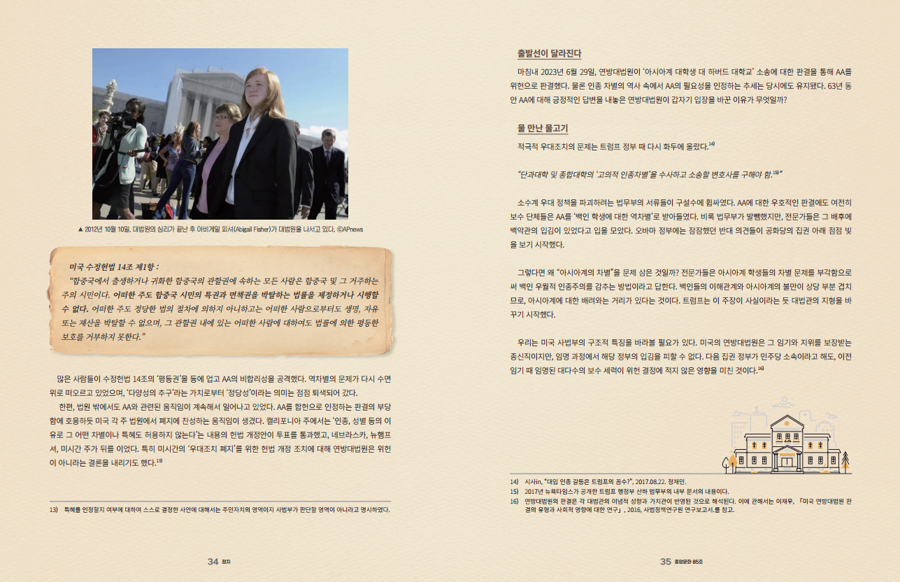 하지만 반대에는 불공정에 대한 시정의 목소리가 있었다. AA는 흑인과 히스패닉을 넘어 저소득 혹은 저학력 가정의 학생들까지 포섭했다. ‘기회의 평등’이라는 이념에 따라 수많은 미국 대학이 부여한 입학 특전29은, 대학의 ‘다양성’이라는 가치를 천명했다.