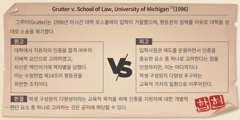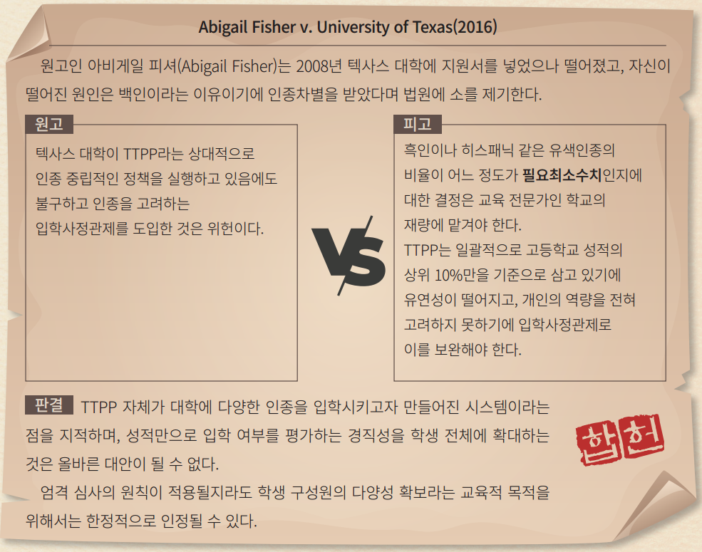 과연 우리가 이 중에 무엇이 더 공평하다고 결정할 수 있겠는가. 물론 개인의 입장에 따라 다르게 해석될 여지가 있다. 지금까지 대법원은 ‘공정’과 ‘다양성’의 균형에 힘썼다. 하지만 얼마 전 위헌 결정은 그 ‘다양성’을 실현하기 위한 방법의 ‘정당성’에 대해 문제를 제기한 것이다.