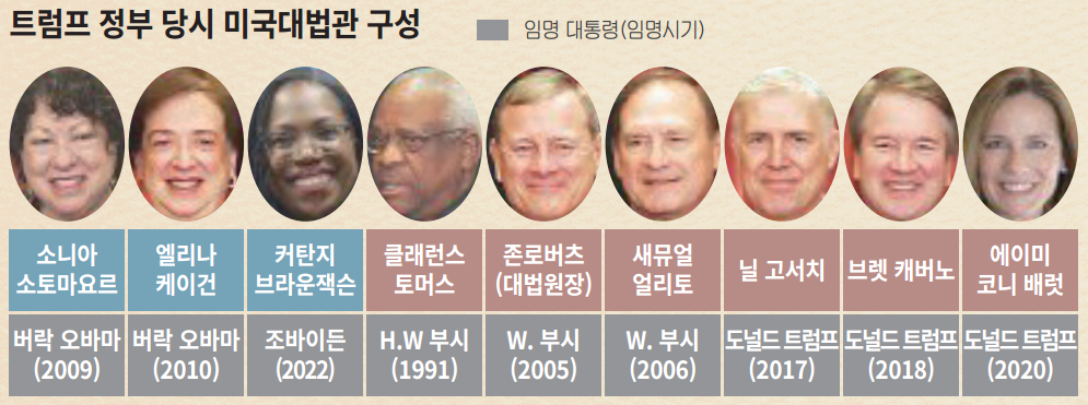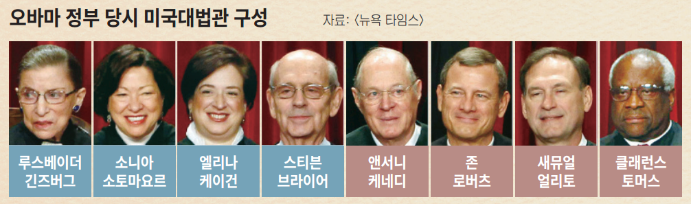 우리는 미국 사법부의 구조적 특징을 바라볼 필요가 있다. 미국의 연방대법원은 그 임기와 지위를 보장받는 종신직이지만, 임명 과정에서 해당 정부의 입김을 피할 수 없다. 다음 집권 정부가 민주당 소속이라고 해도, 이전 임기 때 임명된 대다수의 보수 세력이 위헌 결정에 적지 않은 영향을 미친 것이다.16