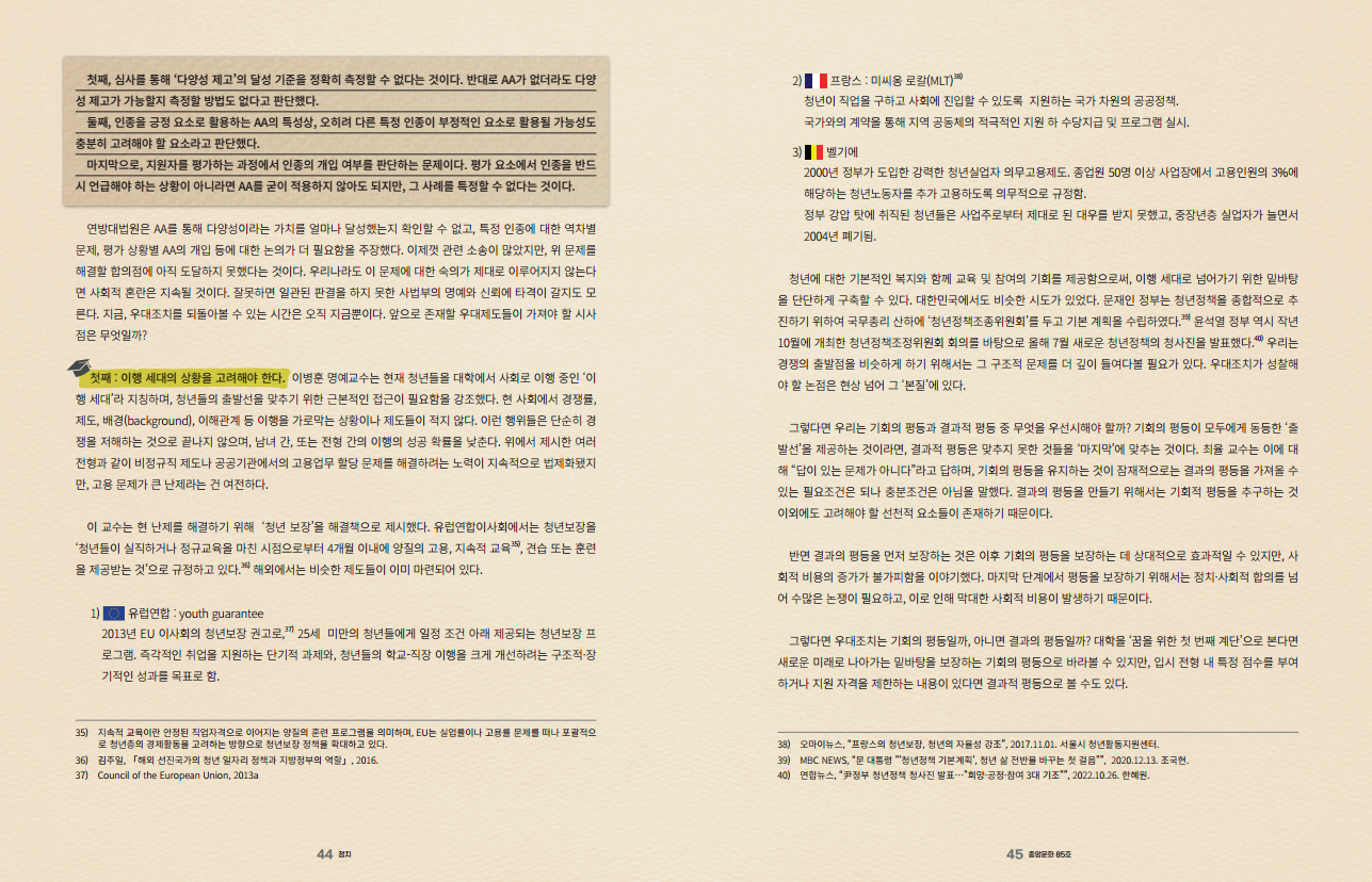 청년에 대한 기본적인 복지와 함께 교육 및 참여의 기회를 제공함으로써, 이행 세대로 넘어가기 위한 밑바탕을 단단하게 구축할 수 있다. 대한민국에서도 비슷한 시도가 있었다. 문재인 정부는 청년정책을 종합적으로 추진하기 위하여 국무총리 산하에 ‘청년정책조종위원회’를 두고 기본 계획을 수립하였다.39 윤석열 정부 역시 작년 10월에 개최한 청년정책조정위원회 회의를 바탕으로 올해 7월 새로운 청년정책의 청사진을 발표했다.40 우리는 경쟁의 출발점을 비슷하게 하기 위해서는 그 구조적 문제를 더 깊이 들여다볼 필요가 있다. 우대조치가 성찰해야 할 논점은 현상 넘어 그 ‘본질’에 있다.