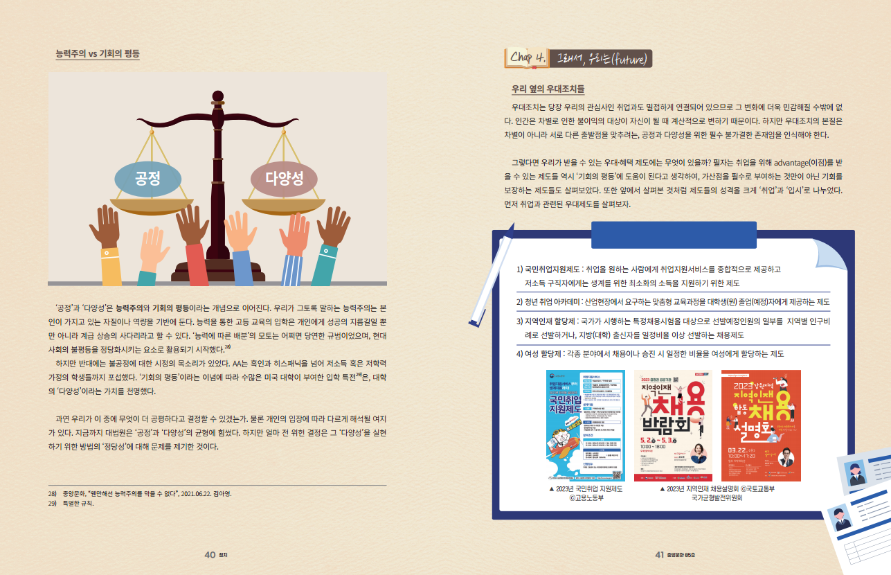 우대조치는 당장 우리의 관심사인 취업과도 밀접하게 연결되어 있으므로 그 변화에 더욱 민감해질 수밖에 없다. 인간은 차별로 인한 불이익의 대상이 자신이 될 때 계산적으로 변하기 때문이다. 하지만 우대조치의 본질은 차별이 아니라 서로 다른 출발점을 맞추려는, 공정과 다양성을 위한 필수 불가결한 존재임을 인식해야 한다.