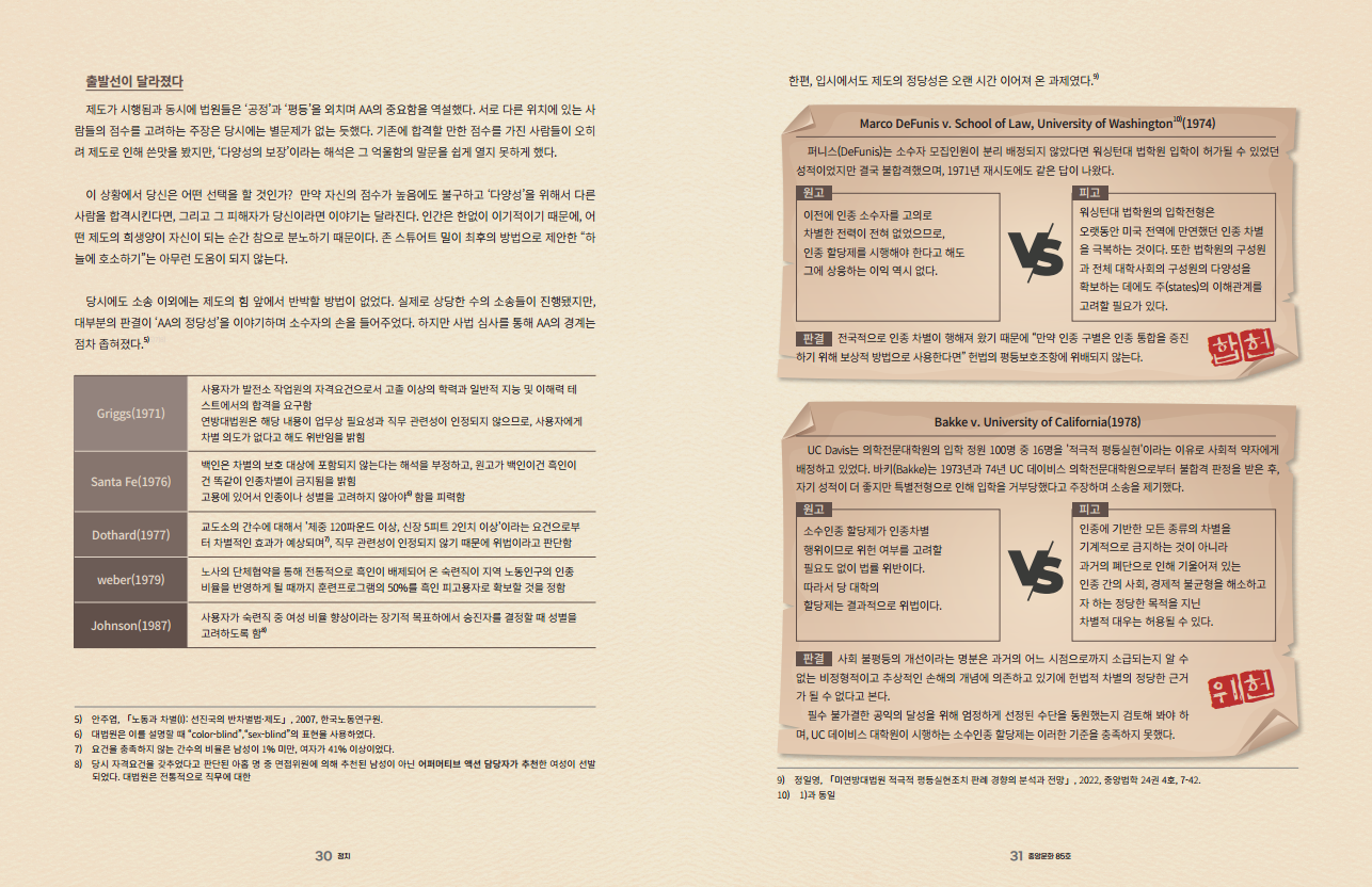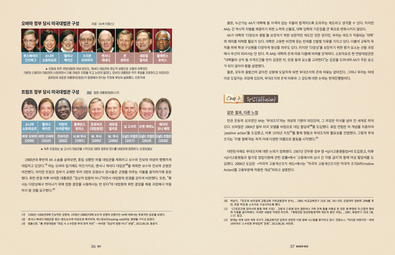 그런데 미국에서는 이 소송이 실제로 일어났다. 2023년 6월, 미국 연방대법원이 소수인종에 대한 '적극적 우대조치(Affirmative Action)'를 위헌으로 판결했다. 그동안 수많은 AA 관련 판결들이 있었지만, 지금의 “The Justice1 ”들은 파격적인 대답을 내놓았다. 그동안 미국의 각 주(states) 법원에서 폐지 여부를 논했던 적은 있지만 연방 대법원에서 공식적으로 의견을 낸 것은 이번이 처음이다.
