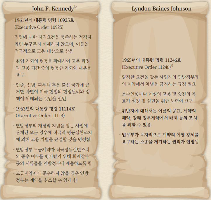 - 행정명령 10925호가 선언적 명령임과 달리, 11114호는 더 구체적인 방향을 지시하였다. 린든 대통령은 11114호의 명령을 더 강력하고 의무에 구속된 명령으로 개정하였다. [본문으로]