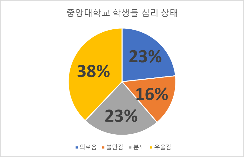 본교 학교생활 상담센터가 발표한 ‘2022 학생 생활 연구 부록 표5에 따르면, 학생들은 ‘외로움(23.2%)’, ‘불안감 (15.44%)’, ‘분노 (23.32%)’, ‘우울감 (37.89%)’로, 적지 않은 수가 심리적 어려움을 겪고 있다고 답했다.6