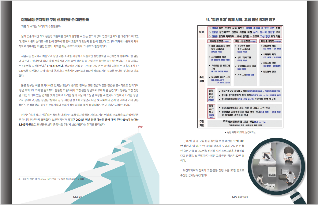 정부는 ‘약자 복지 강화’라는 목적을 내세우며 소득·일자리·돌봄 서비스 지원 범위에, 저소득층·노인·장애인 뿐만 아니라 청년까지 포함했다. 보건복지부가 공개한 2024년 청년 관련 예산은 올해 대비 무려 43%가 늘어난 3,309억 원으로, 청년들을 보다 촘촘하고 두텁게 보호하겠다는 취지를 드러냈다.
