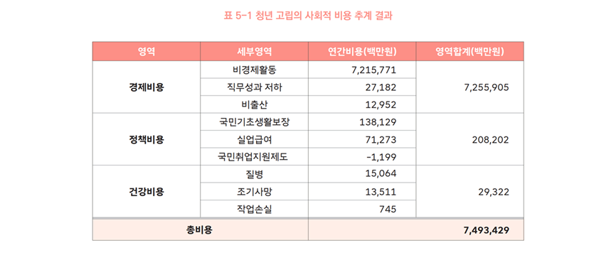 청년 재단 연구 결과에 따르면, 고립 청년 비율이 약 4%가 늘어나면 연간 약 16조 9천억 원의 사회적 비용이 발생한다. 반대로 고립 청년 비율이 1%만 감소해도 사회적 비용은 4조 8천억 원까지 줄어든다. 따라서 정부에서 고립 청년을 대상으로 지원사업을 시행할 시 단기 비용은 증가할지라도 1인당 연간 약 2천 2백만 원 상당의 사회적 비용을 절감할 수 있다. 즉 고립·은둔 청년 지원사업에 1인당 300만 원을 지원한다면 총 5,400억(18만명)을 투자하여 4조 원을 절감할 수 있다는 것이다.