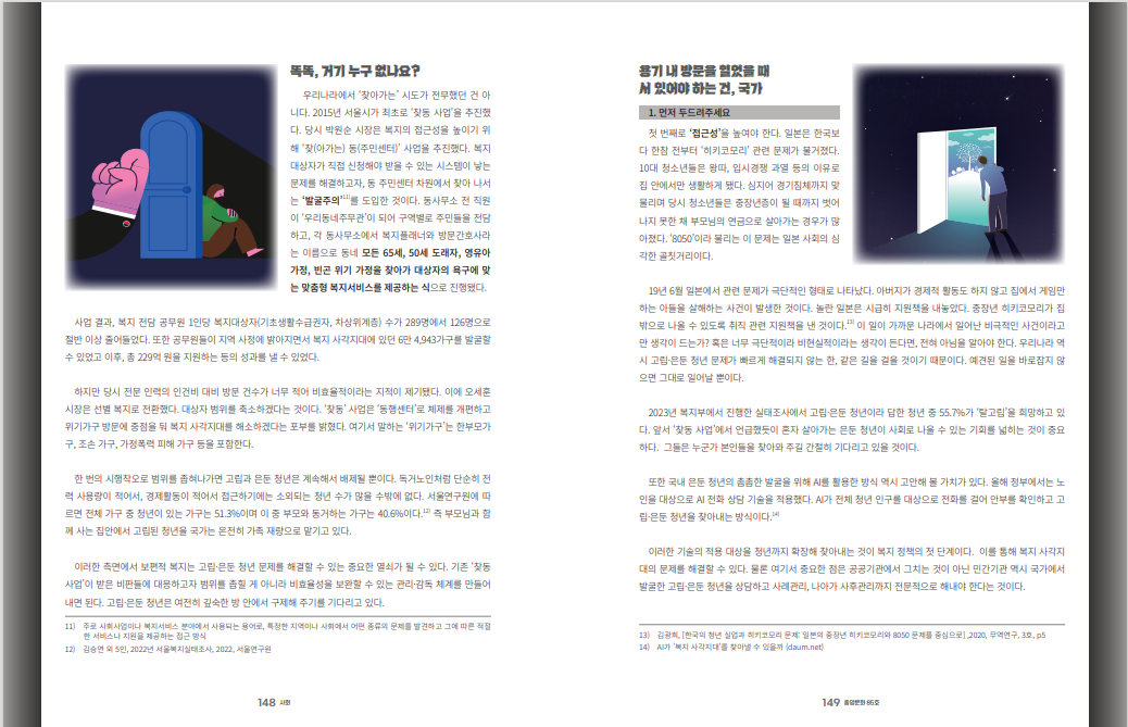 이러한 측면에서 보편적 복지는 고립·은둔 청년 문제를 해결할 수 있는 중요한 열쇠가 될 수 있다. 기존 ‘찾동 사업'이 받은 비판들에 대응하고자 범위를 좁힐 게 아니라 비효율성을 보완할 수 있는 관리·감독 체계를 만들어 내면 된다. 고립·은둔 청년은 여전히 깊숙한 방 안에서 구제해 주기를 기다리고 있다.