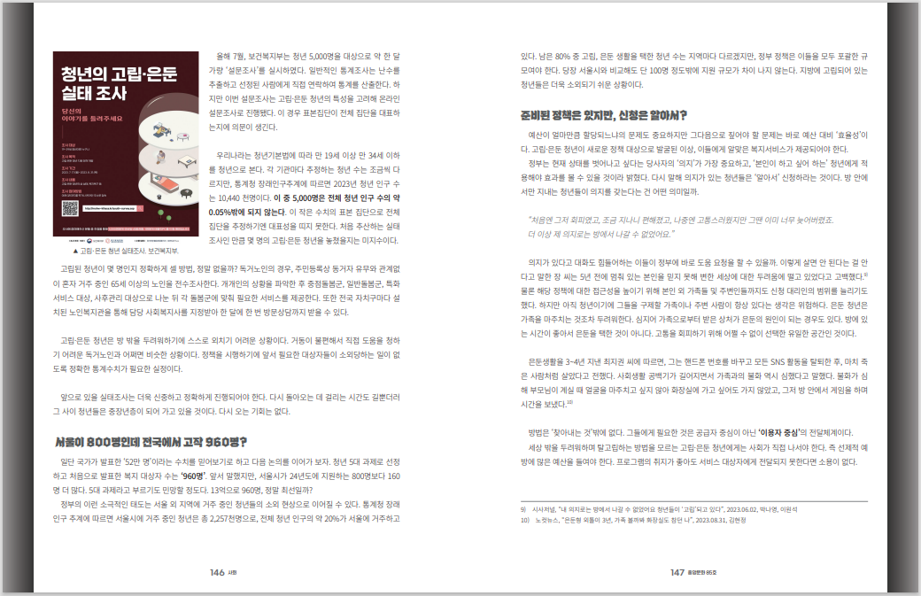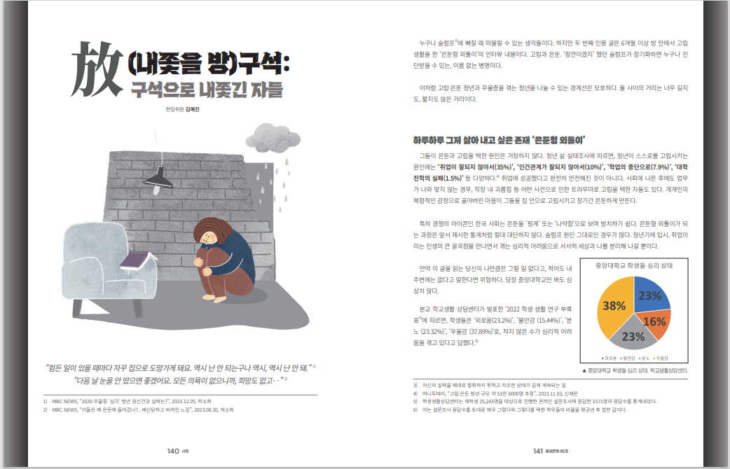 - 시사저널, “내 의지로는 방에서 나갈 수 없었어요 청년들이 ‘고립’되고 있다”, 2023.06.02, 박나영, 이원석 [본문으로]