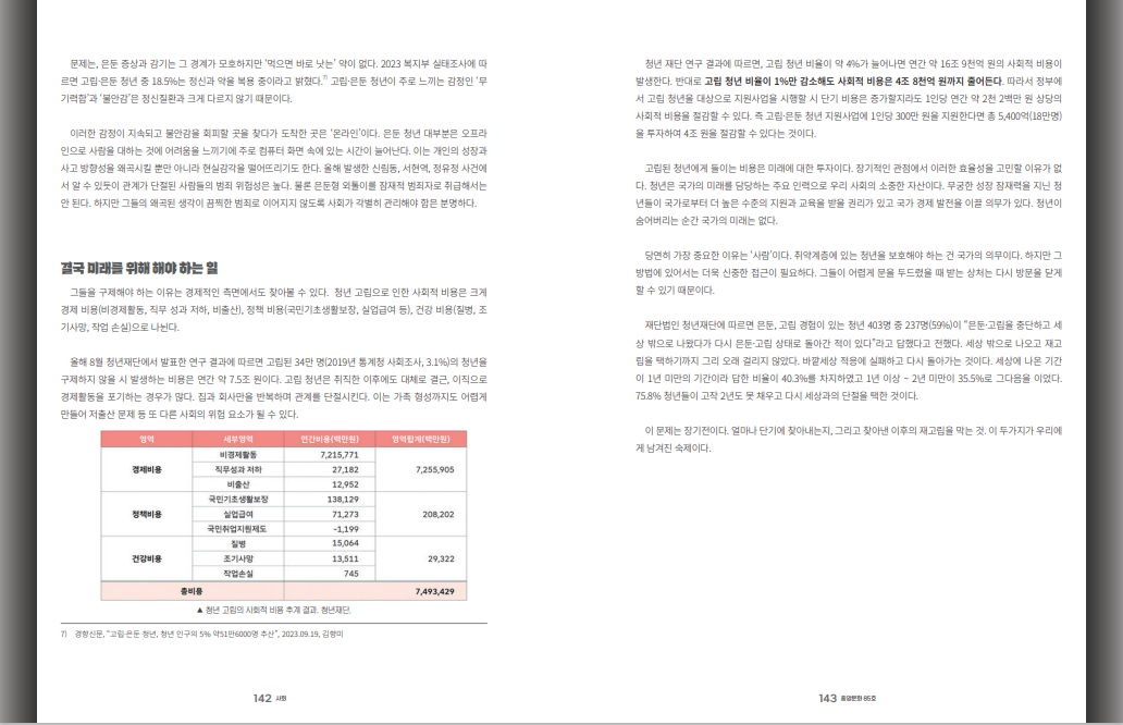 고립된 청년에게 들이는 비용은 미래에 대한 투자이다. 장기적인 관점에서 이러한 효율성을 고민할 이유가 없다. 청년은 국가의 미래를 담당하는 주요 인력으로 우리 사회의 소중한 자산이다. 무궁한 성장 잠재력을 지닌 청년들이 국가로부터 더 높은 수준의 지원과 교육을 받을 권리가 있고 국가 경제 발전을 이끌 의무가 있다. 청년이 숨어버리는 순간 국가의 미래는 없다.
