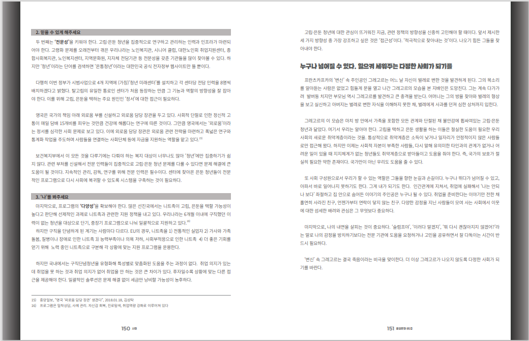 그레고르의 이 모습은 마치 방 안에서 가족을 포함한 모든 관계와 단절된 채 불안감에 휩싸여있는 고립·은둔 청년과 닮았다. 여기서 우리는 알아야 한다. 고립을 택하고 은둔 생활을 하는 이들은 절실한 도움이 필요한 우리 사회의 새로운 취약계층이라는 것을. 통상적으로 취약계층은 소득이 낮거나 일자리가 안정적이지 않은 사람들로만 접근해 왔다. 하지만 이제는 사회적 자본이 부족한 사람들, 다시 말해 유의미한 타인과의 관계가 없거나 어려운 일이 있을 때 지지체계가 없는 청년들도 취약계층으로 받아들이고 도움을 줘야 한다. 즉, 국가의 보호가 절실히 필요한 약한 존재이다. 국가만이 아닌 우리도 도움을 줄 수 있다.