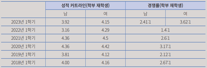 코로나19 시기 성적 평가 방식이 변경되고, 기존의 다인실을 1인실로 사용하게 되며 2020년과 2021년에는 이례적으로 높은 성적 커트라인이 형성됐다. 하지만 이전 연도에서 확인할 수 있듯이 기숙사 성적 커트라인은 원래 높았다. 또 코로나19 이후인 2023년 커트라인 역시 여전히 높다. 참고로 2023년 2학기에는 기숙사 관별 입관 신청을 받아 각 건물별 성적 커트라인을 확인할 수 있었다. 전체 건물의 평균을 내면 남학생은 약 3.5, 여학생은 약 3.7 정도의 성적 커트라인이 형성됐다.