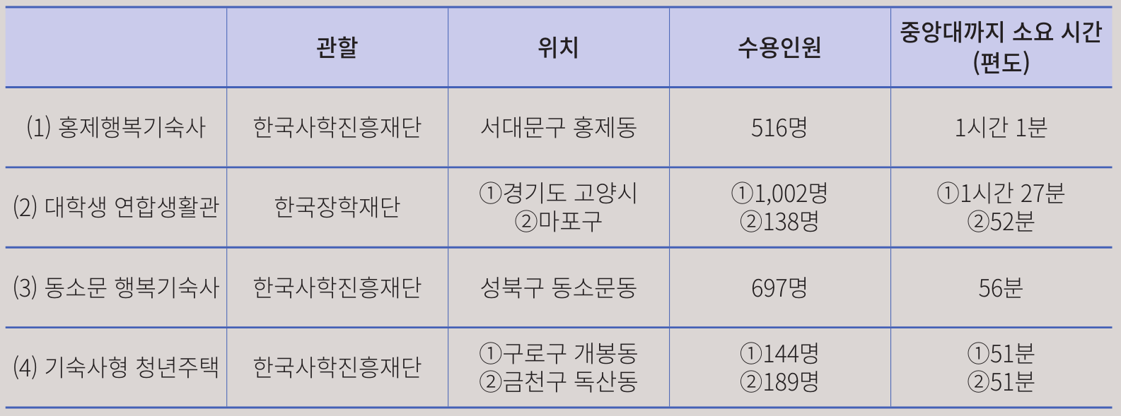표의 ‘중앙대까지 소요 시간(편도)’ 부분에서 확인할 수 있듯이 모든 연합기숙사에 중앙대까지는 상당한 시간이 소요된다. 가장 가까운 기숙사도 ‘편도 51분’의 통학을 해야한다. 표에 표기한 시간에는 버스 환승 시 소요 시간과 교통 상황을 포함하지 않고 있기 때문에 실제론 더 오랜 시간이 걸릴 수 있다. ‘홍제행복기숙사’에서 1년 동안 거주했던 필자는 당시 중앙대학교까지 편도 1시간 20분가량이 소요됐다. 연합기숙사에 거주할 수 있다는 것을 행운으로 여겼지만, 차가 조금이라도 막히면 왕복 3시간이 걸리는 통학에 지쳐 결국 자취를 택했다.