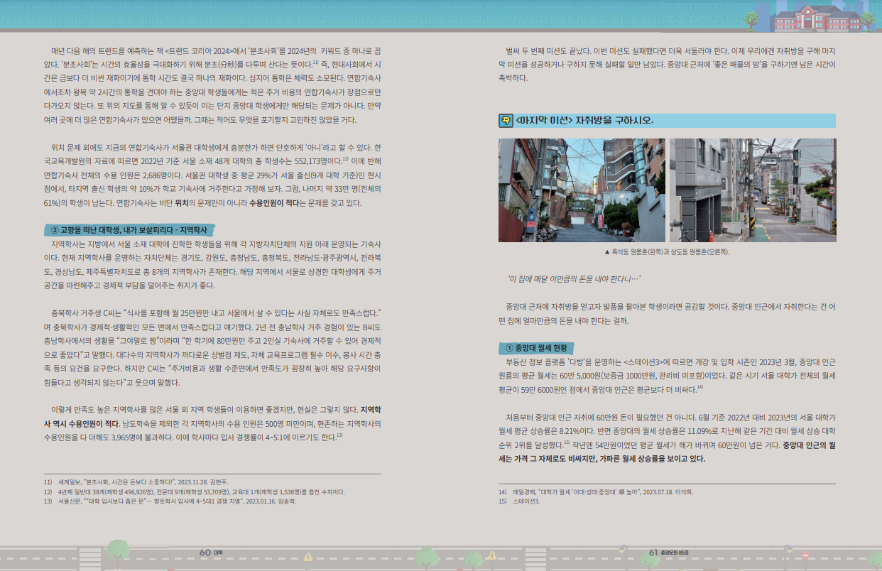 매년 다음 해의 트렌드를 예측하는 책 <트렌드 코리아 2024>에서 ‘분초사회’를 2024년의 키워드 중 하나로 꼽았다. ‘분초사회’는 시간의 효율성을 극대화하기 위해 분초(分秒)를 다투며 산다는 뜻이다.12 즉, 현대사회에서 시간은 금보다 더 비싼 재화이기에 통학 시간도 결국 하나의 재화이다. 심지어 통학은 체력도 소모된다. 연합기숙사에서조차 왕복 약 2시간의 통학을 견뎌야 하는 중앙대 학생들에게는 적은 주거 비용의 연합기숙사가 장점으로만 다가오지 않는다. 또 위의 지도를 통해 알 수 있듯이 이는 단지 중앙대 학생에게만 해당되는 문제가 아니다. 만약 여러 곳에 더 많은 연합기숙사가 있으면 어땠을까. 그때는 적어도 무엇을 포기할지 고민하진 않았을 거다.