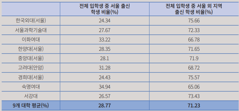 현재 서울 소재 주요 대학의 기숙사 수용률이 적절한지 확인하기 위해 각 학교의 서울 출신 학생 비율을 살펴봤다.