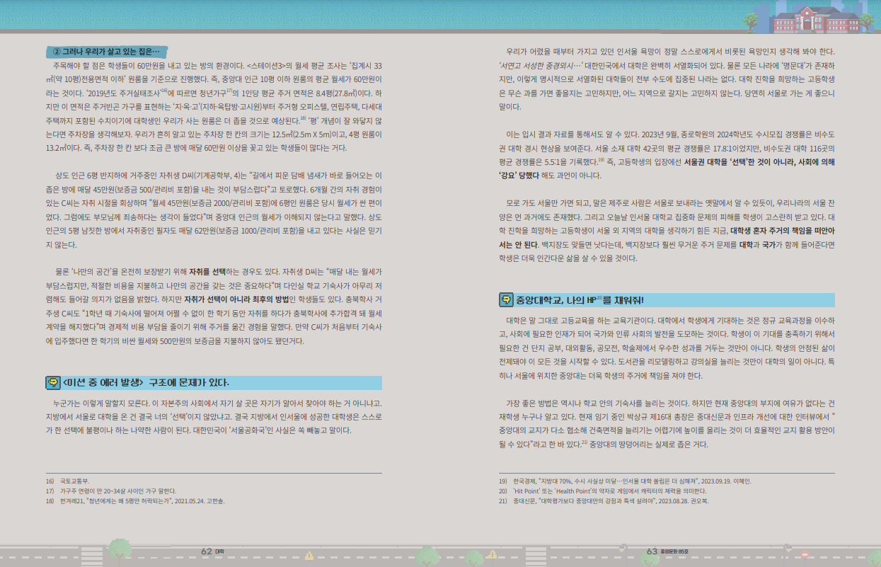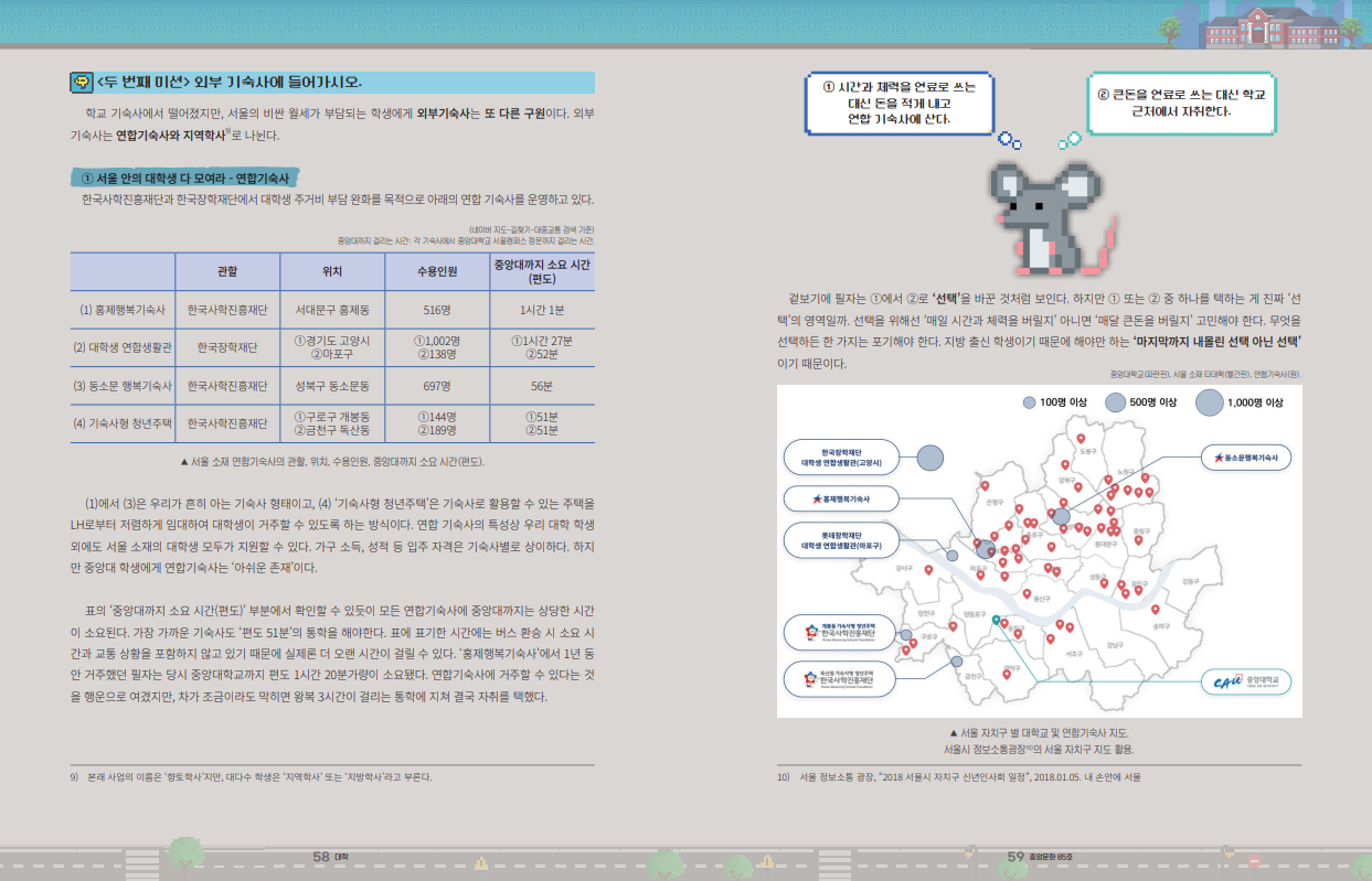 학교 옆에 본가가 있지 않은 이상, 우리는 중앙대에 입학한 순간부터 <서울에서 살아남기> 미션을 시작한다. 먼저 학교 기숙사에 지원하고, 떨어지면 외부 기숙사에 지원하고, 또 떨어지면 셰어하우스, 하숙, 자취 중 무얼 선택할지 고민한다. 사실 고민할 수 있다는 것만으로도 당신은 미션 성공이다. 미션에 실패하면 왕복 4시간을 넘게 통학하거나, 강제 휴학이다.