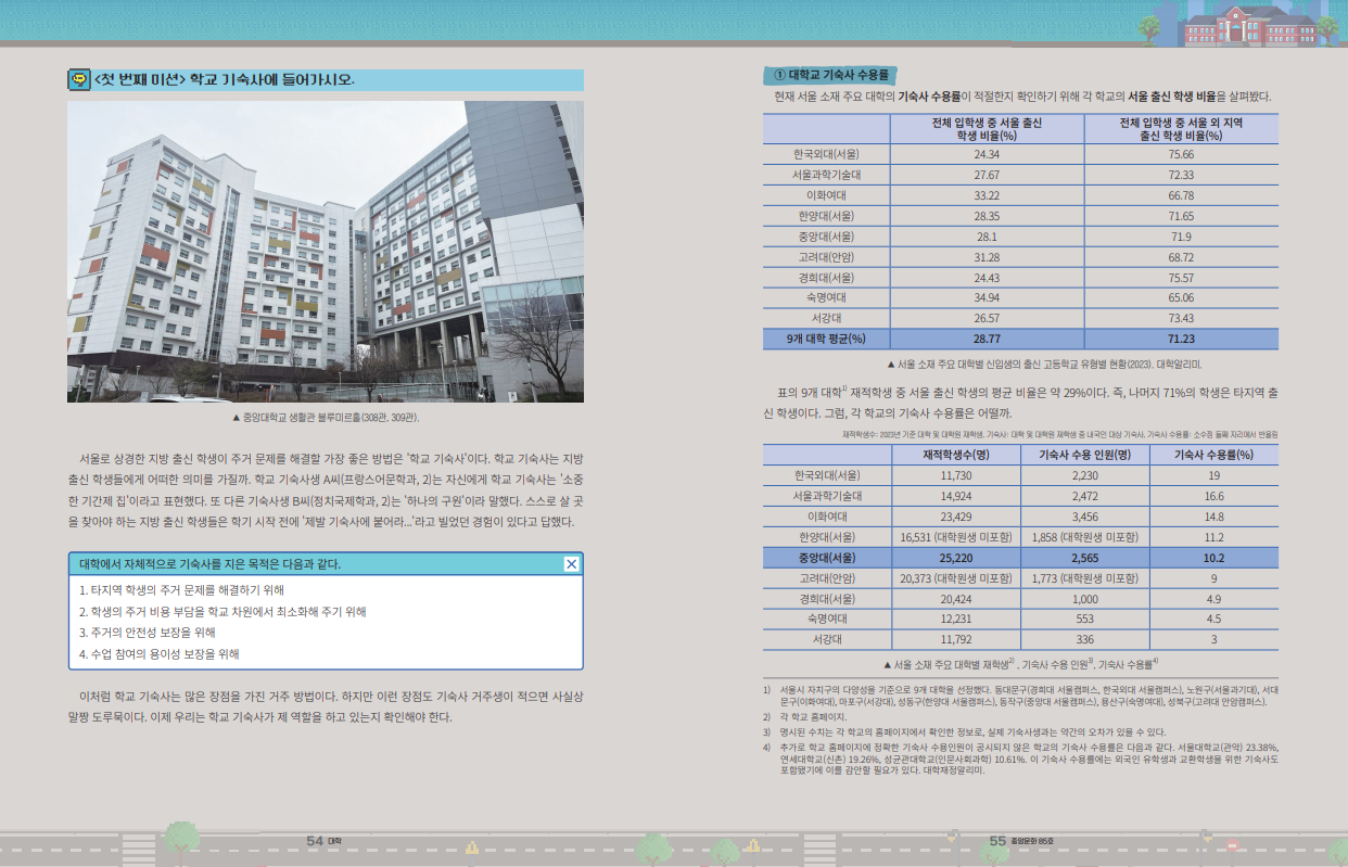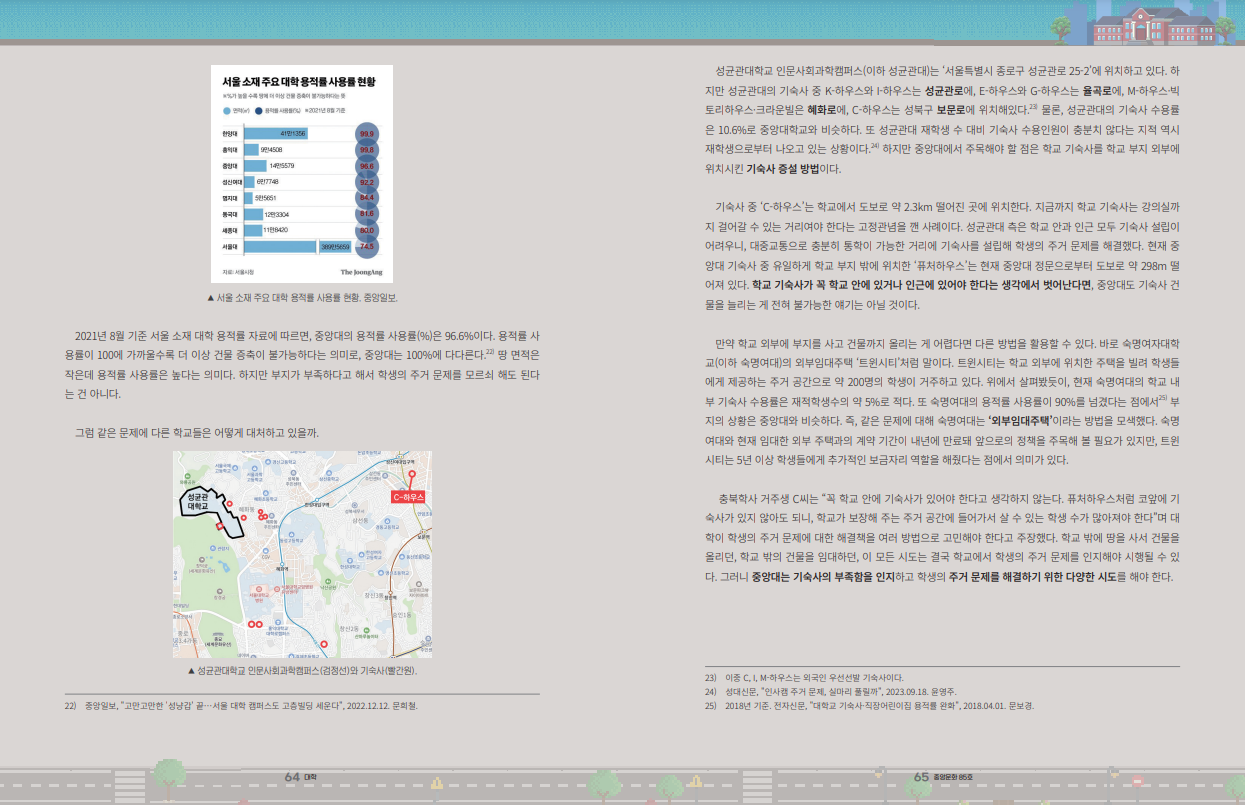2021년 8월 기준 서울 소재 대학 용적률 자료에 따르면, 중앙대의 용적률 사용률(%)은 96.6%이다. 용적률 사용률이 100에 가까울수록 더 이상 건물 증축이 불가능하다는 의미로, 중앙대는 100%에 다다른다.23 땅 면적은 작은데 용적률 사용률은 높다는 의미다. 하지만 부지가 부족하다고 해서 학생의 주거 문제를 모르쇠 해도 된다는 건 아니다.