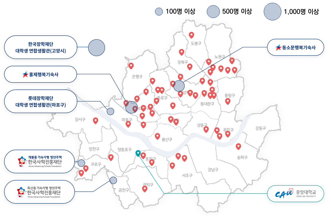 중앙대학교(파란핀), 서울 소재 타대학(빨간핀), 연합기숙사(원).