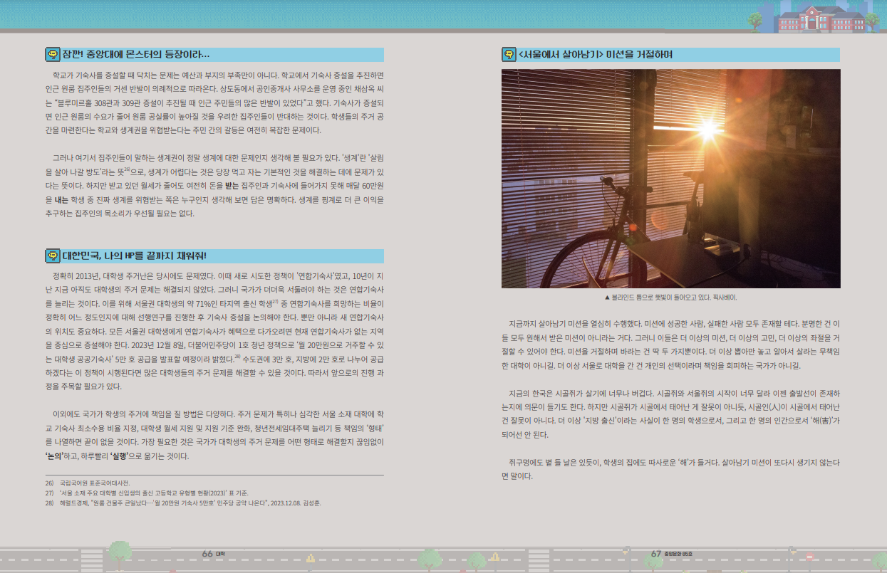 누군가는 이렇게 말할지 모른다. 이 자본주의 사회에서 자기 살 곳은 자기가 알아서 찾아야 하는 거 아니냐고. 지방에서 서울로 대학을 온 건 결국 너의 ‘선택’이지 않았냐고. 결국 지방에서 인서울에 성공한 대학생은 스스로가 한 선택에 불평이나 하는 나약한 사람이 된다. 대한민국이 ‘서울공화국’인 사실은 쏙 빼놓고 말이다.