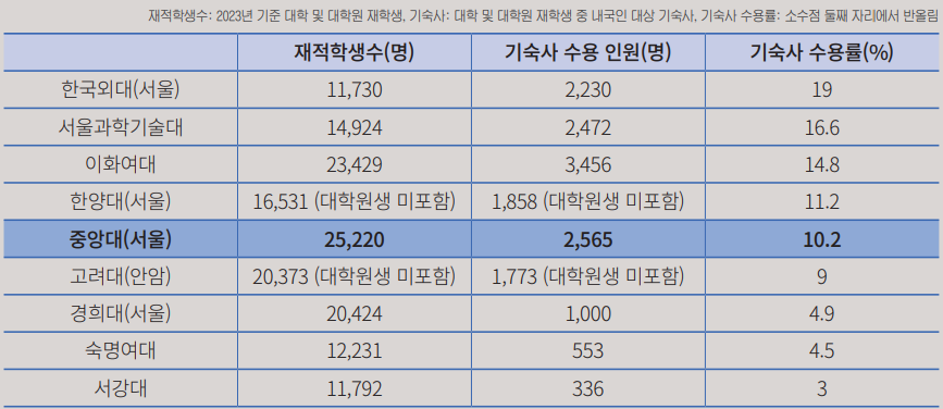 먼저 중앙대학교 서울캠퍼스(이하 중앙대)의 재적학생수는 2023년 기준 25,220명이다. 하지만 학교 기숙사 수용인원은 2,408명으로 재학생의 약 10%만을 기숙사에 수용할 수 있다. 나머지 2만 명이 넘는 학생들은 본가에서 통학하거나, 외부 기숙사에 들어가거나, 자취를 하고 있다. 타대학과의 비교 결과, 놀랍게도 중앙대의 기숙사 수용률은 평균 정도이다. 그렇다고 해서 중앙대가 잘하고 있다 보기는 어렵다. 전체 학생 중 약 71%의 학생이 타지역 출신(9개 대학 기준)인 데 반해 모든 대학의 학교 기숙사 수용률은 턱없이 적다.