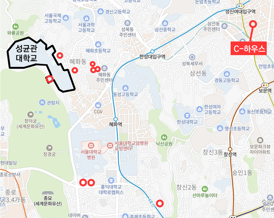성균관대학교 인문사회과학캠퍼스(이하 성균관대)는 ‘서울특별시 종로구 성균관로 25-2’에 위치하고 있다. 하지만 성균관대의 기숙사 중 K-하우스와 I-하우스는 성균관로에, E-하우스와 G-하우스는 율곡로에, M-하우스·빅토리하우스·크라운빌은 혜화로에, C-하우스는 성북구 보문로에 위치해있다.24 물론, 성균관대의 기숙사 수용률은 10.6%로 중앙대학교와 비슷하다. 또 성균관대 재학생 수 대비 기숙사 수용인원이 충분치 않다는 지적 역시 재학생으로부터 나오고 있는 상황이다.25 하지만 중앙대에서 주목해야 할 점은 학교 기숙사를 학교 부지 외부에 위치시킨 기숙사 증설 방법이다.