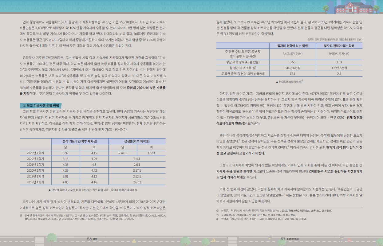 뿐만 아니라 성적장학금을 폐지하고 저소득층 장학금을 늘린 대학의 등장은 '성적'이 모두에게 공정한 요소가 아님을 증명했다.7 좋은 성적에 장학금을 주는 정책은 성취와 보상을 연계한 제도지만, 성취를 위한 조건의 균등화가 제대로 이루어지지 않았다는 점을 간과한 것이다.8 따라서 기숙사 입사를 위한 현재의 성적 평가 방식이 진정 옳고 공정하다고 평가하기 어렵다.