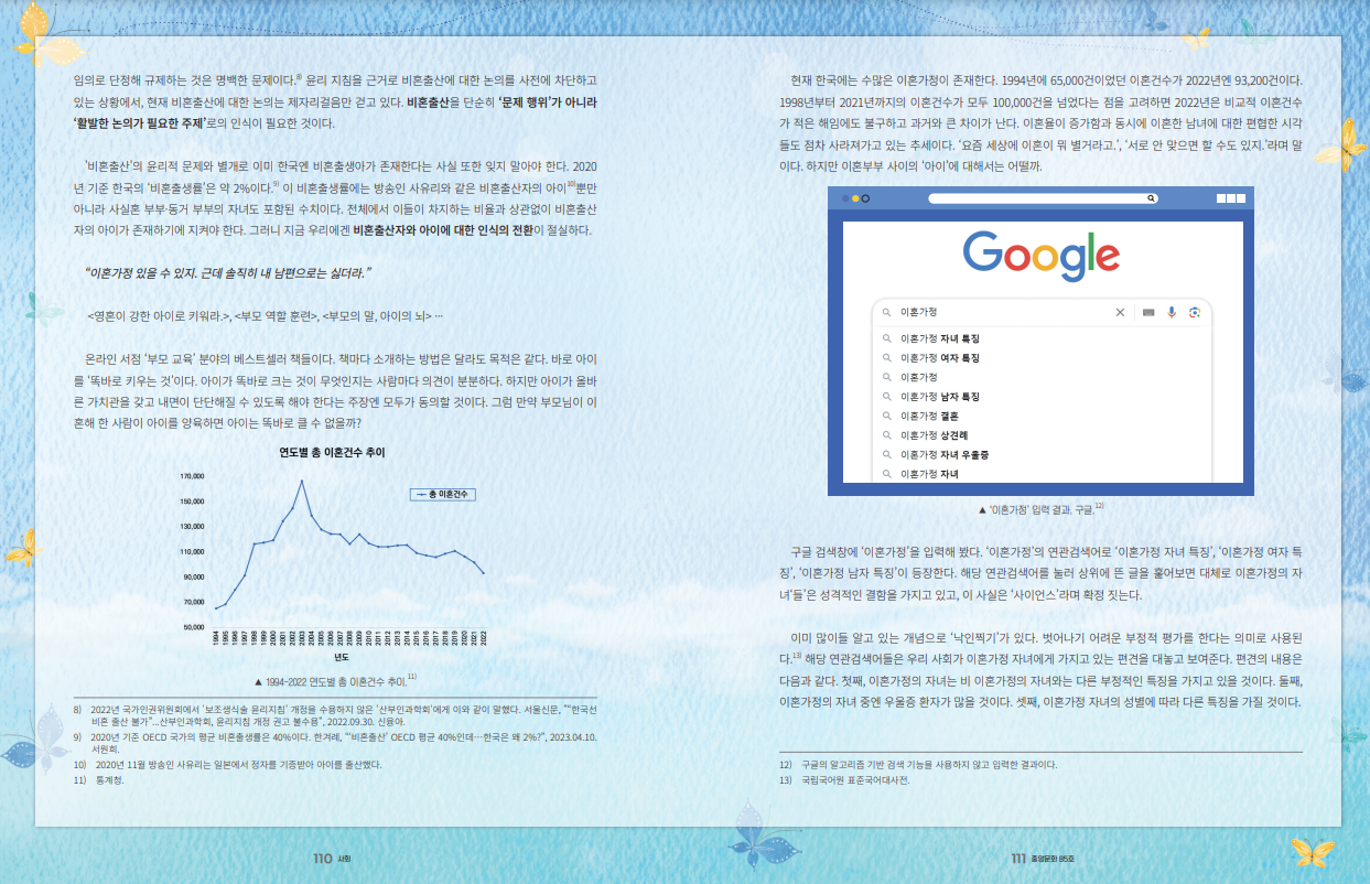 현재 한국에는 수많은 이혼가정이 존재한다. 1994년에 65,000건이었던 이혼건수가 2022년엔 93,200건이다. 1998년부터 2021년까지의 이혼건수가 모두 100,000건을 넘었다는 점을 고려하면 2022년은 비교적 이혼건수가 적은 해임에도 불구하고 과거와 큰 차이가 난다. 이혼율이 증가함과 동시에 이혼한 남녀에 대한 편협한 시각들도 점차 사라져가고 있는 추세이다. ‘요즘 세상에 이혼이 뭐 별거라고.’, ‘서로 안 맞으면 할 수도 있지.’라며 말이다. 하지만 이혼부부 사이의 ‘아이’에 대해서는 어떨까.