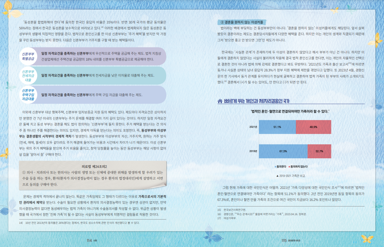 한국에는 ‘사실혼 관계’가 존재하기에 두 이성이 결혼하지 않았다고 해서 부부가 아닌 건 아니다. 하지만 이 둘에게 결혼하지 않았다는 사실이 불리하게 작용해 결국 법적 혼인신고를 한다면, 이는 개인의 자율적인 선택으로 결혼한 것이 아니라 법에 의해 강제로 결혼했다고 봐도 무방하다. ‘2021년도 가족과 출산 보고서’14에 따르면 동거나 사실혼 상태의 남녀 응답자 28.3%가 정부 지원 혜택에 제한을 겪었다고 답했다. 또 2023년 4월, 경향신문의 한 기사에서 동거 관계를 유지하다가 현실에 굴복하고 결혼하여 법적 가족이 된 부부의 사례가 소개되기도 했다.15 결혼해서 (+)가 될 수는 있어도, 안 한다고 (-)가 되면 안 된다.